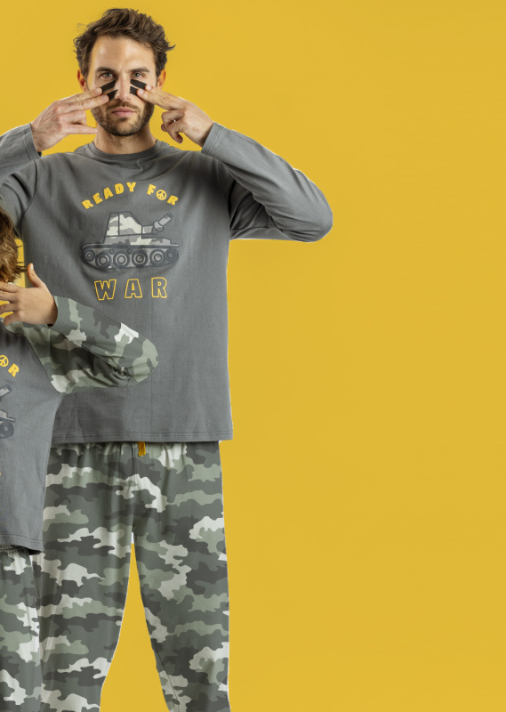 Камуфлированные хлопоковые брюки на манжетах. Пояс на резинке с регулируемой кулиской. Джемпер с округлым вырезом горловины. декорирован прорезиненной аппликацией в виде танка и надписью Ready for War