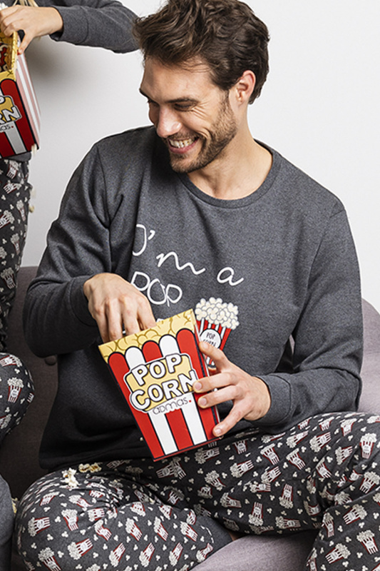 Мужская пижама в подарочной коробке в виде банки из-под попкорна. Принтованные брюки (принт попкорн) на манжетах, с поясом на резинке и регулируемой кулиской. Меланжевый джемпер с округлым вырезом горловины, декорирован аппликацией с надписью I am a pop corn big fan. Рукава с манжетами. Вшивной пояс-резинка.