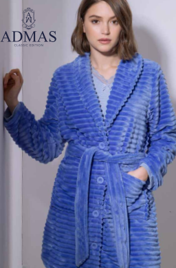Короткий халат из флиса в рубчик. Отложный воротки, пуговица, пояс. Два наклданых кармана.