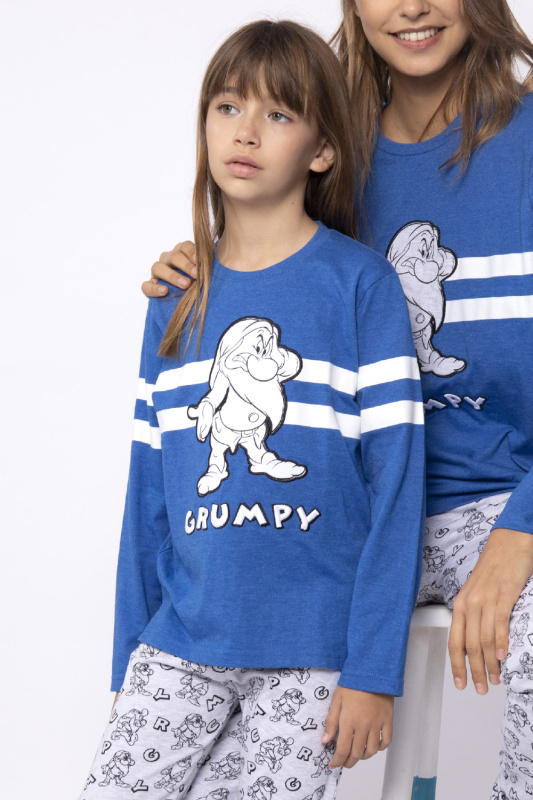 Меланжевые брюки из принтованного волокна (принт гномы), с контрастными синими манжетами. Пояс на резинке. Меланжевый джемпер с округлым вырезом горловины и бейкой в тон. Прокрашенные полосы на груди и рукавах. Небольшие боковые разреы. Декорирован вышитой апликацией.