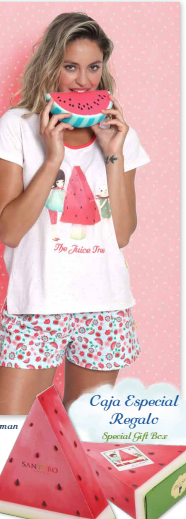 Футболка из меланжевого полотна с округлым вырезом горловины и контрастной бейкой. Декорирована апликацией и вышивкой The juice free. Небольшие боковые разрезы. Шорты из принтованного хлопка (принт арбузы и цветы). Пояс на резинке с регулируемой кулиской. Упакована в коробку с форме дольки арбуза.