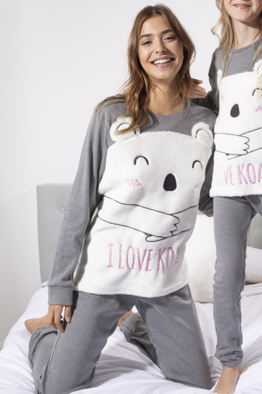 Уютный джемпер с округлым вырезом горловины и бейкой в тон. Перед выполнен из пушистого плюша и виде мордочки коалы и надписью I love koala, с вышивкой. Небольшие боковые разрезы. Рукава с манжетами.