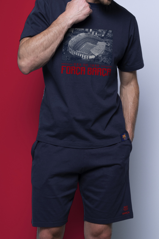 Хлопковая пижама с логотипом футбольного клуба "Барселона". Футболка с округлым вырезом горловины и бейкой в тон, декорирована аплиацией со стадионом клуба и надписью "Барса, вперед!". Шорты с карманами, пояс на резинке с регулируемой кулиской
