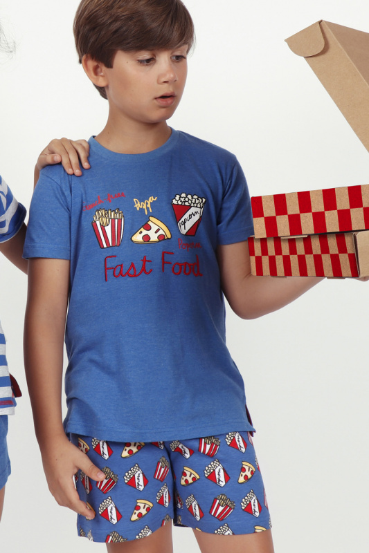 Футболка с округлым вырезом горловины и бейкой в тон. Декорирована апликацией и вышивкой Fast Food. Небольшие боковые разрезы. Принтованные шорты с поясом на резинке.