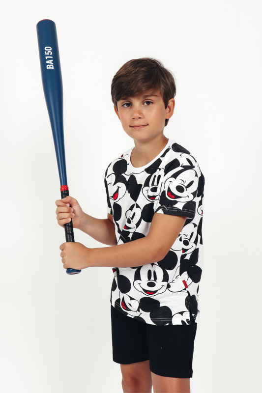 Принтованная хлопковая футболка с небольшими боковыми разрезами, с округлым вырезом горловины и белой бейкой. Хлопковые однотонные шорты с поясом на резинке.