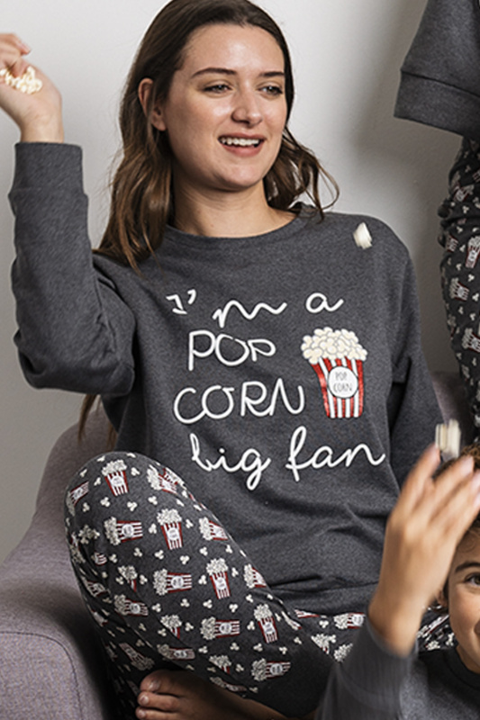 Меланжевый джемпер с округлым вырезом горловины. Декорирован аппликацией с глиттером I'm pop corn big fan. Вшивная планка-резинка на поясе. Рукава на манжетах. Принтованные брюки-джоггеры (принт поп корн). Пояс на резинке с регулируемой кулиской. Упакова в коробке в виде банки поп корна