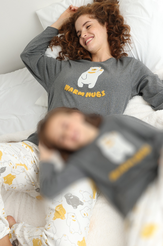 Меланжевый джемпер с округлым вырезом горловины. Декорирован апплицированным махровым медвежеком с вышивкой и надписью warm hugs. Небольшие боковые разрезы. Хлопковые брюки-джоггеры с принтом "медвежата". Пояс на резинке с регулируемой кулиской.