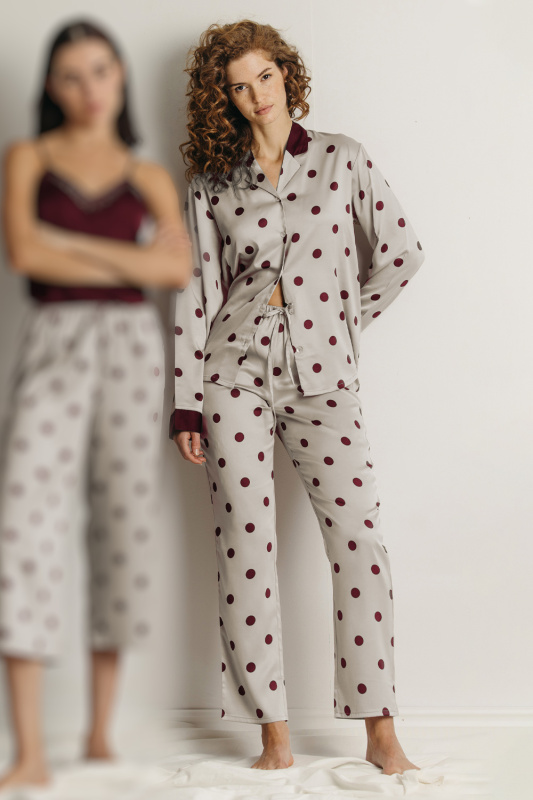 Классическая пижама из высококачественного искусственного шелка. Рубашка на пуговицах с отлодным воротником и контрастными манжетами. Брюки прямого кроя с резинкой на поясе и регулируемой кулиской