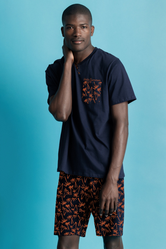 Шорты из принтованного хлопка (принт пальмы), с поясом на резинке с регулируемой кулиской. Меланжевая футболка с округлым вырезом горловины и планкой с пуговицами. Декорирована нагрудным кармашком в цвет шорт и апплицированной надписью Hello Summer