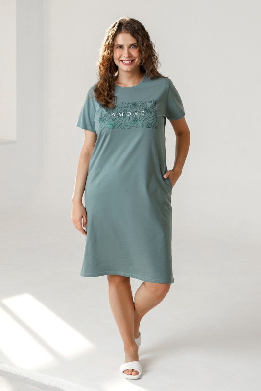 Туника женская из гладокрашенного трикотажного полотна «кулирка», прямого силуэта, с короткими втачными рукавами, горловиной овальной формы, окантованной основным материалом, карманами и разрезами в боковых швах и принтом на полочке в технике «шелкография».